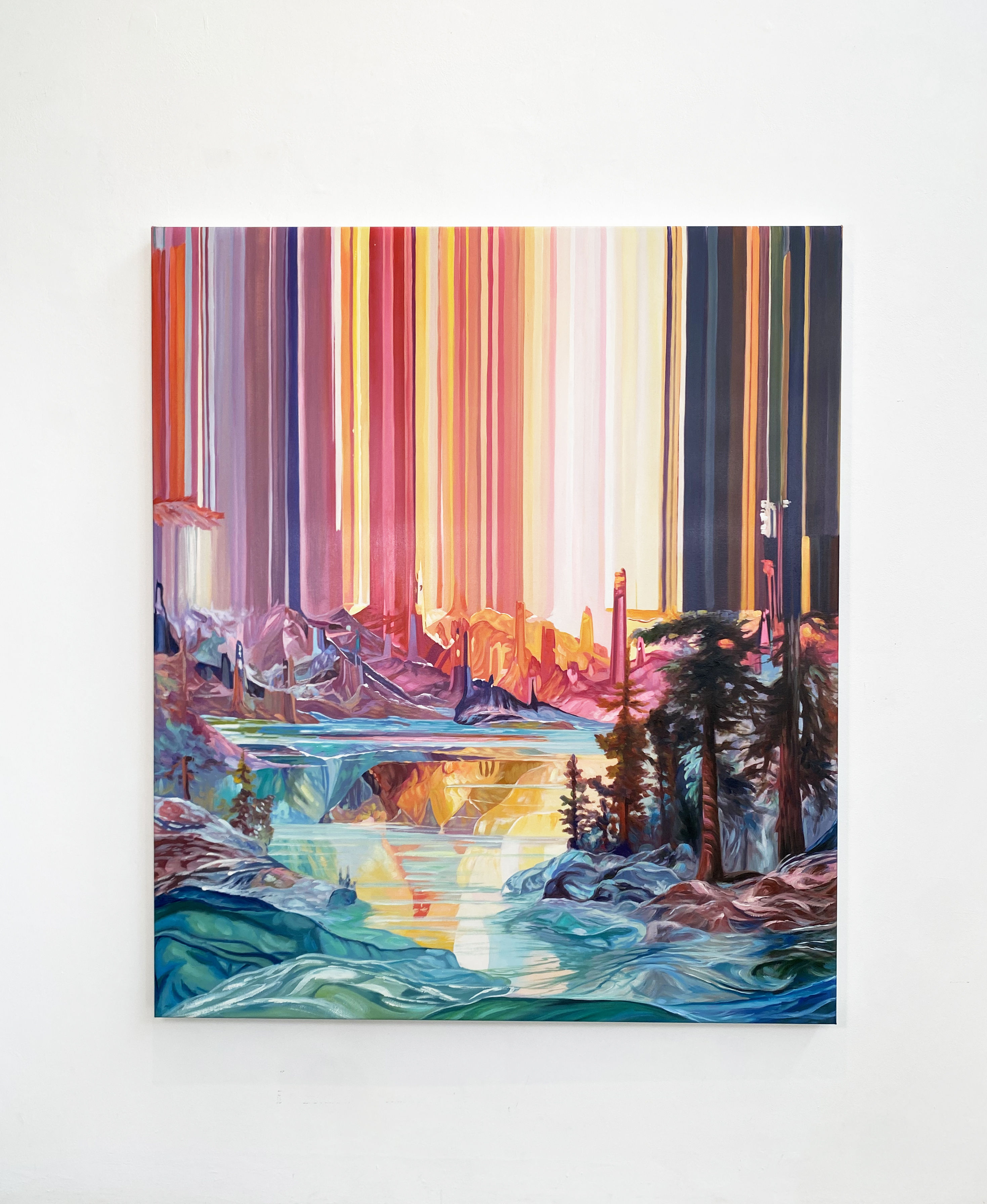 Digital technology has always informed my practice. It is often the first step in my painting process, whether beginning with a photograph, a digital collage, or more recently, AI and algorithmically generated imagery. Once I've mocked the painting up digitally, I mark it up on a canvas and begin the painting process.
